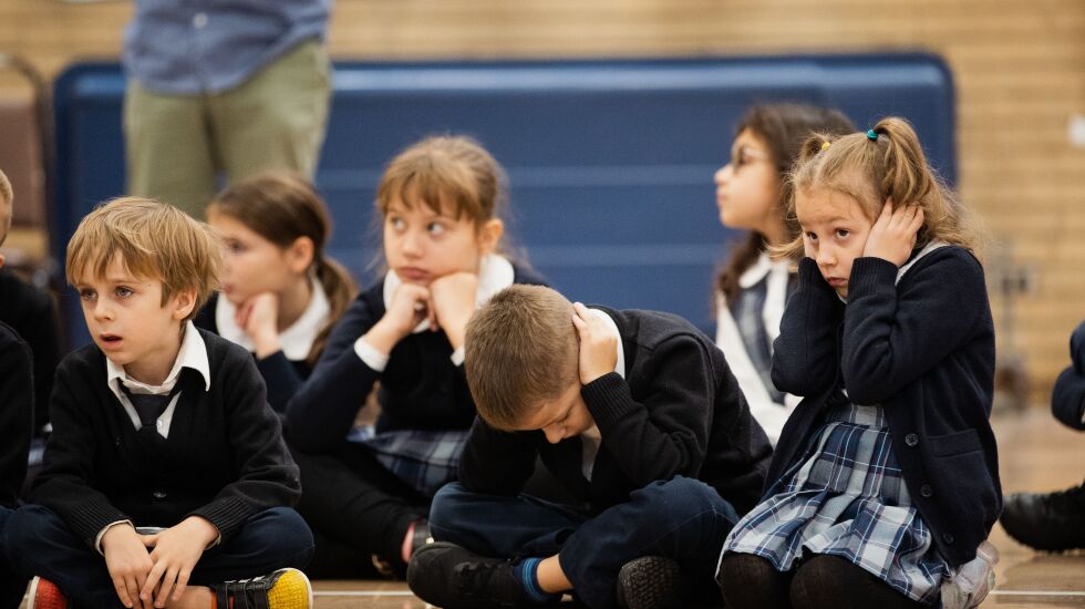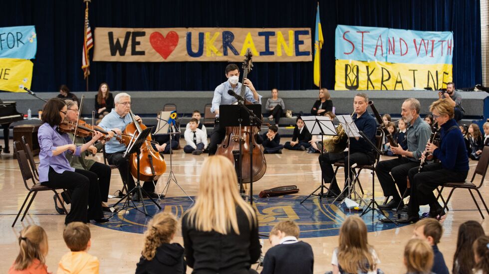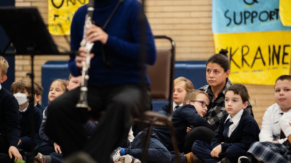 On Friday, Andrew and Arsen were among the 200 or so grade schoolers — including 68 other Ukrainian refugee children — who gathered in the school’s gym to listen to the Lyric musicians. The ensemble was part of a much larger concert in April that raised money to help support several of the families that have left war-torn Ukraine for Chicago.