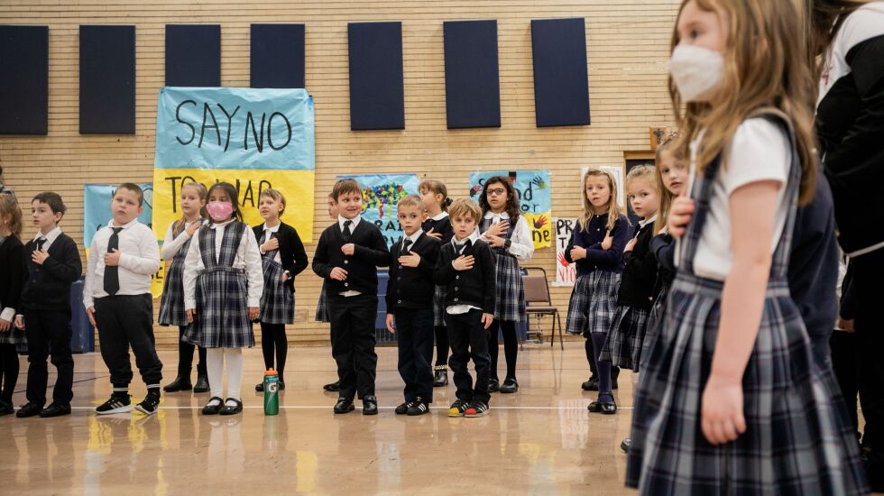 When the musicians began playing the Ukrainian national anthem, all the children and teachers rose to their feet, hands on hearts, the sound of their voices filling the gym to the rafters.