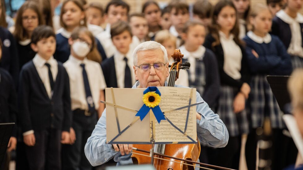 The musicians played in a gym decorated in a sea of blue and yellow with banners reading: “Glory to the heroes,” “Ukraine never gives up” and “Say no to war.”