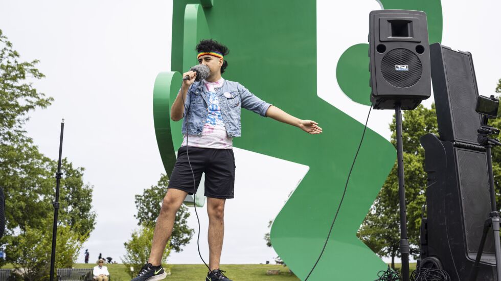 Jeremy Saxon-Maldonado, who identifies as “gender-queer” and uses they/them pronouns, urged the crowd to “imagine a better world” while bemoaning the pop stars, politicians and corporations co-opting Pride Month to advance their own interests.