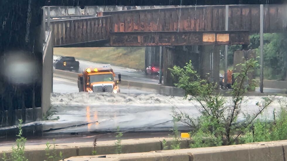 A plow clears water in the closed eastbound lanes of Interstate 290 amid record rainfall Sunday. (Nader Issa/Sun-Times)
