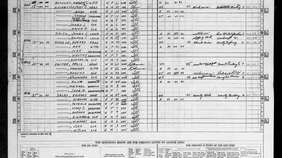 Richard J. Daley was just 47 when he filled out the 1950 Census, which includes his wife Eleanor and each of their seven children. At the time, he was serving as Cook County clerk but would go on to become mayor five years later. His son, former Mayor Richard M. Daley, was 7.