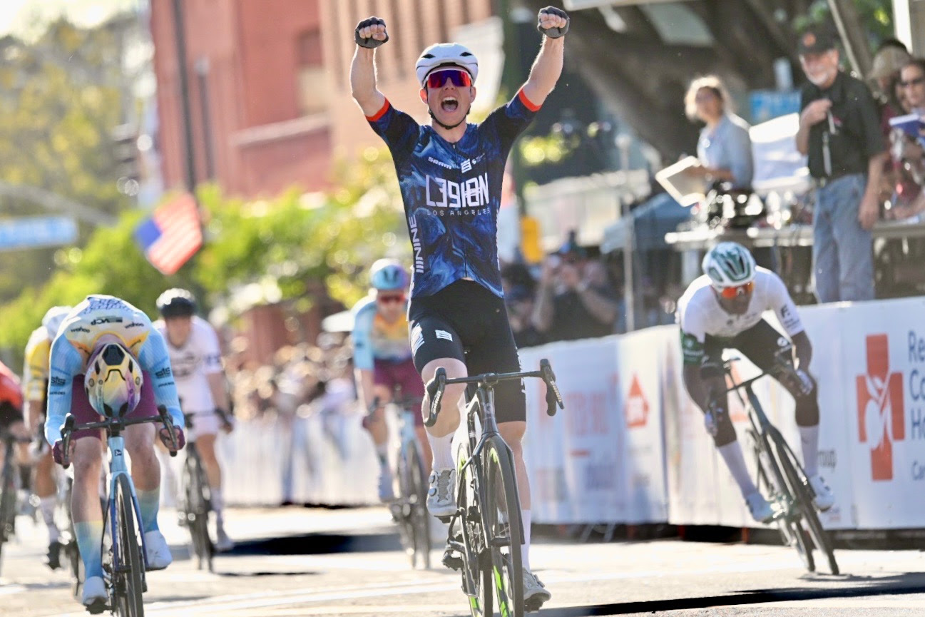 Ella Sabo (Virginia’s Blue Ridge TWENTY28) and Jim Brown (L39ION of Los Angeles) claimed the bunch sprint victory at the stage 4 downtown criterium of the Redlands Bicycle Classic on Saturday.