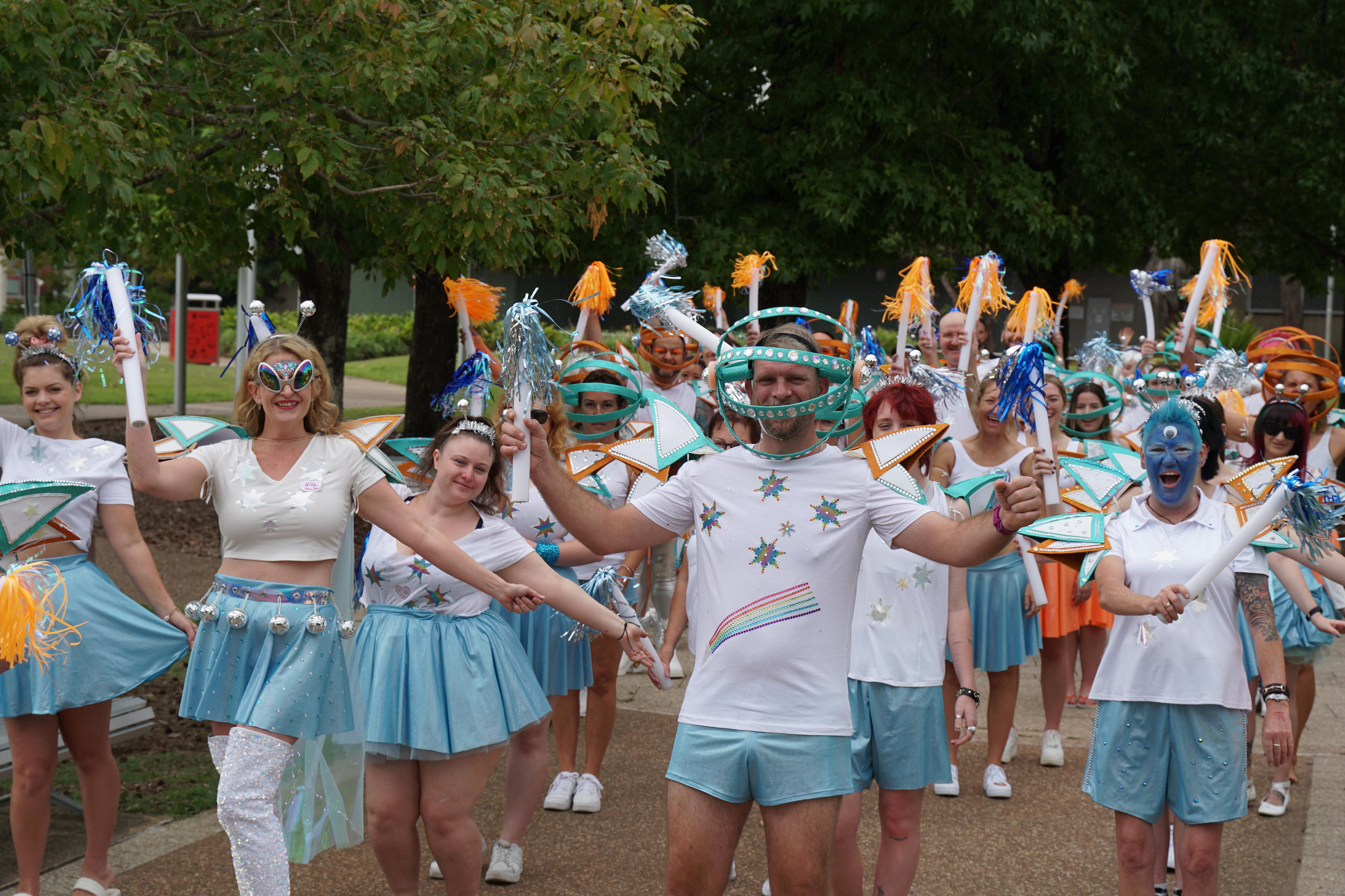 The float's theme is 'riding the rainbow to the golden guitar' with members set to wear vests in rainbow colours that each took more than three hours to sew.