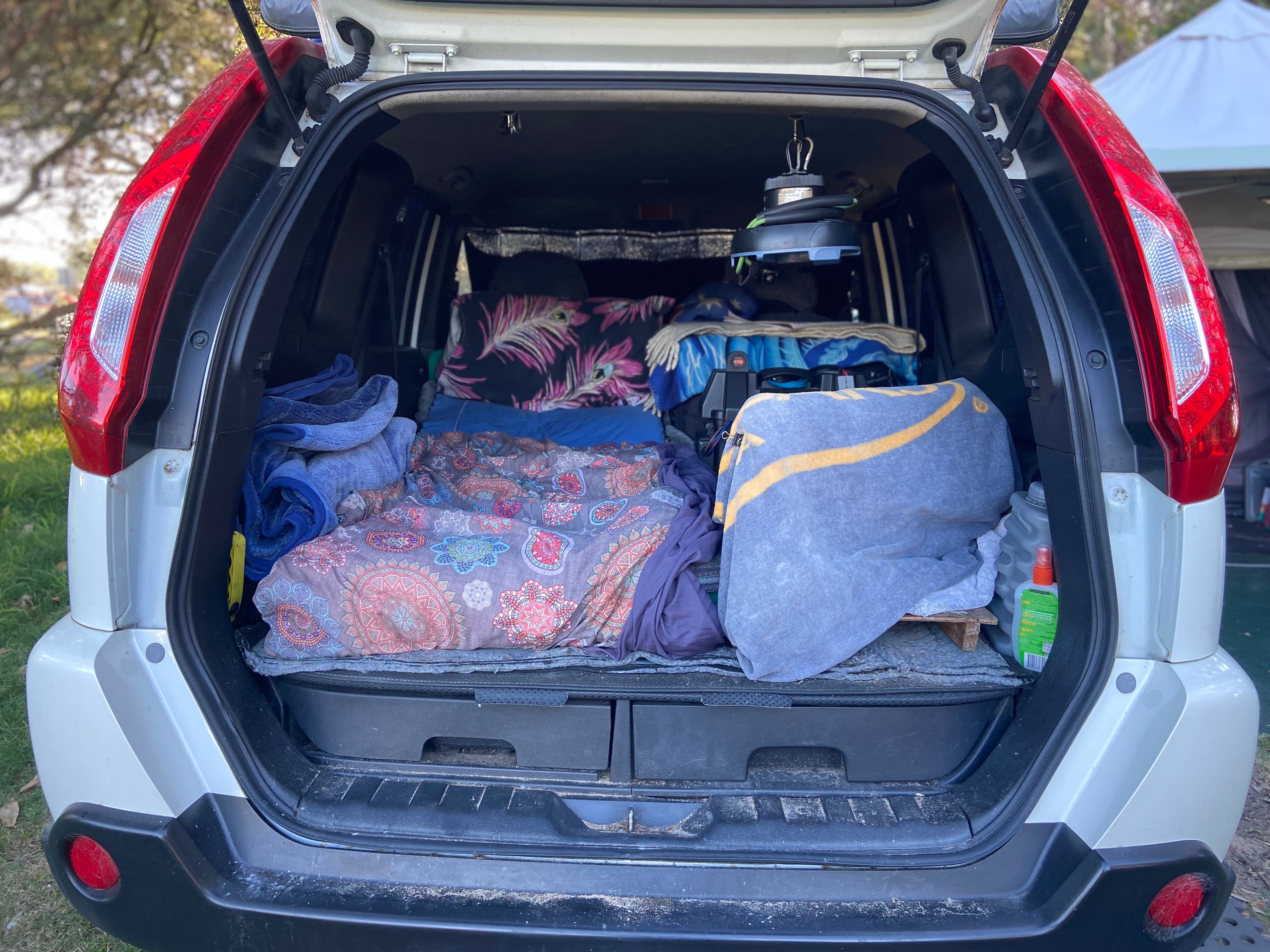 Perry sleeps in the back of his car and stores his personal items in a tent. (ABC South East: Fatima Olumee)