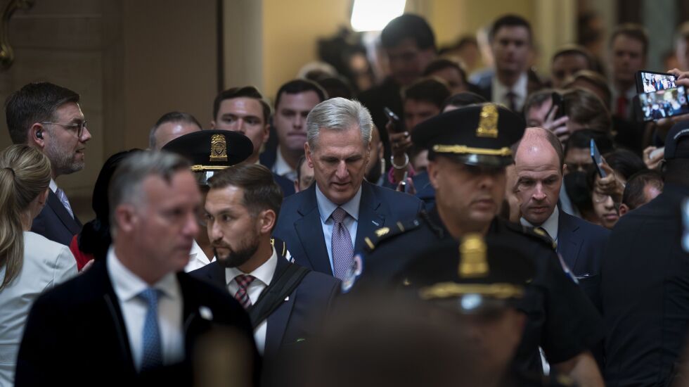WASHINGTON — The three GOP House members from Illinois — Mary Miller, Darin LaHood and Mike Bost — all opposed removing Rep. Kevin McCarthy as speaker on Tuesday, though the votes of eight Republican hard-liners were enough to oust a speaker for the first time in the nation’s history.