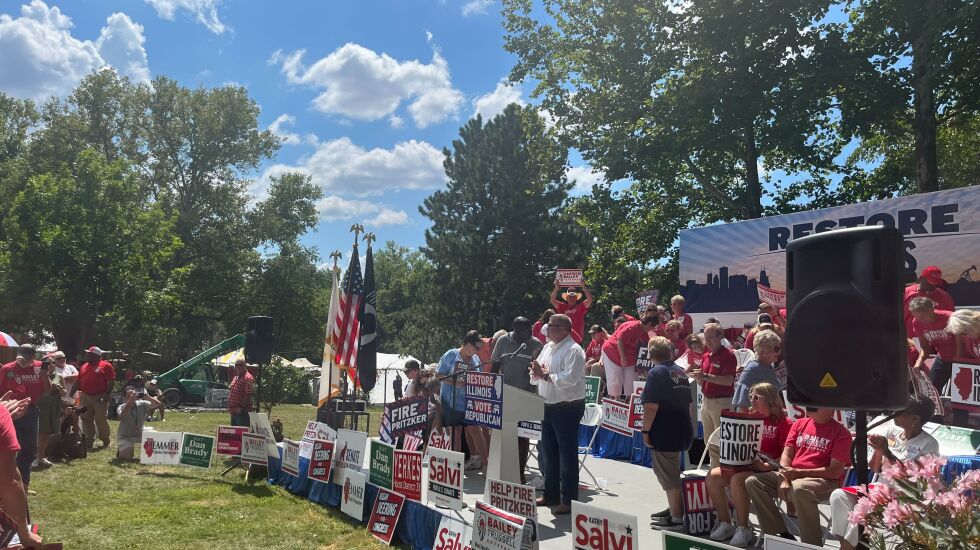 The state senator’s big hurrah on the fairgrounds came a day after Illinois Republican Party Chair Don Tracy hosted a unity event, with former GOP primary rivals Richard Irvin, Gary Rabine and Jesse Sullivan in attendance. Sullivan, a venture capitalist from downstate Petersburg, also came to Thursday’s State Fair events.