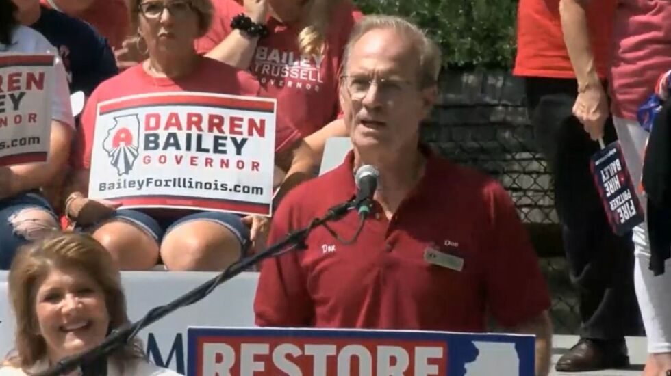 Bailey once again called Chicago a “hellhole” during his rally remarks, blaming crime on “legislators going soft on criminals” and pointing fingers at Pritzker, Cook County State’s Attorney Kim Foxx and Chicago Mayor Lori Lightfoot. Asked later if he believes “most Chicagoans” feel they live in a “hellhole,” Bailey said yes.