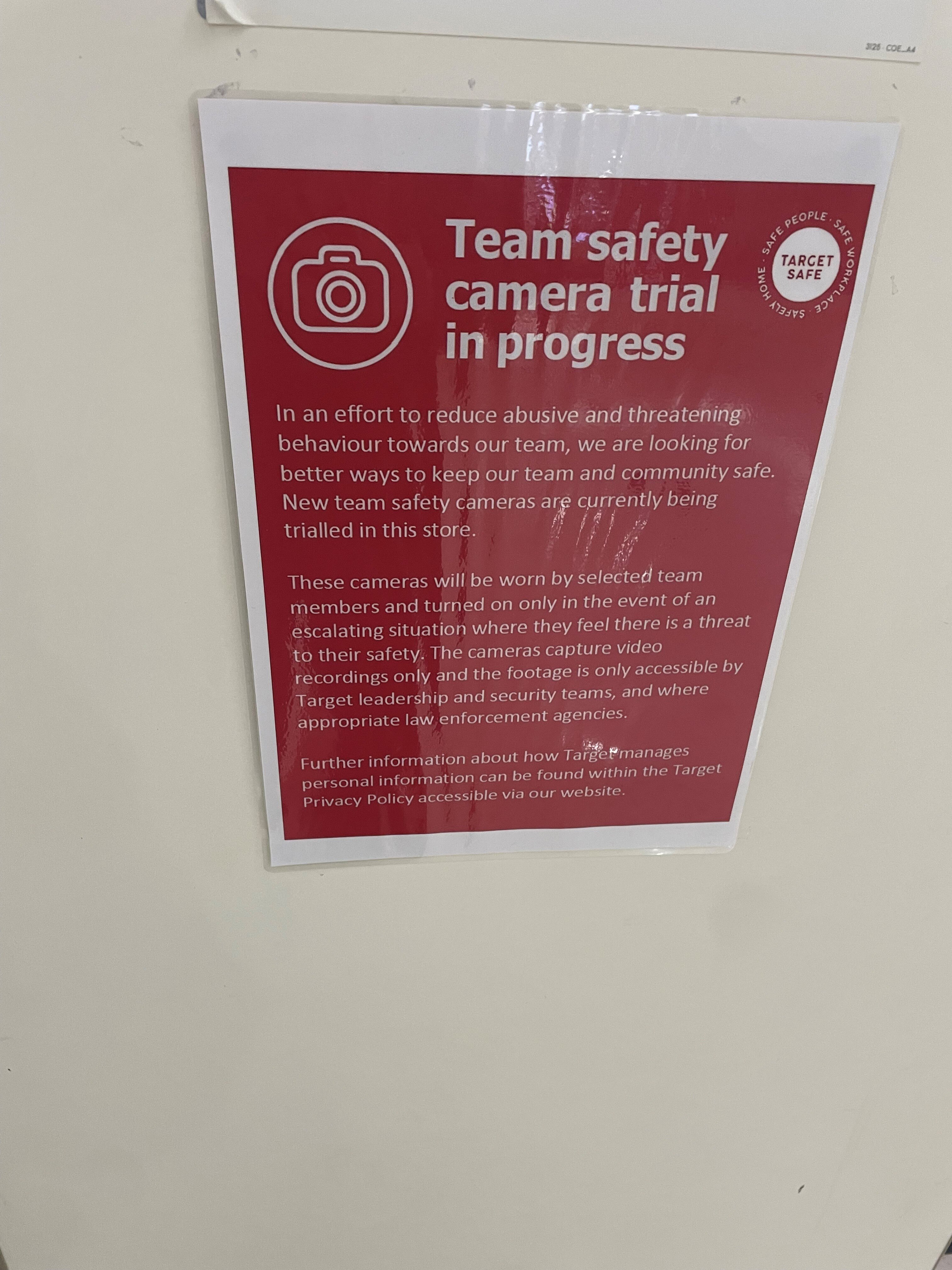 A sign at the Buranda Target store explained that selected staff members would wear the cameras as part of a safety trial "looking for better ways to keep our team and community safe".