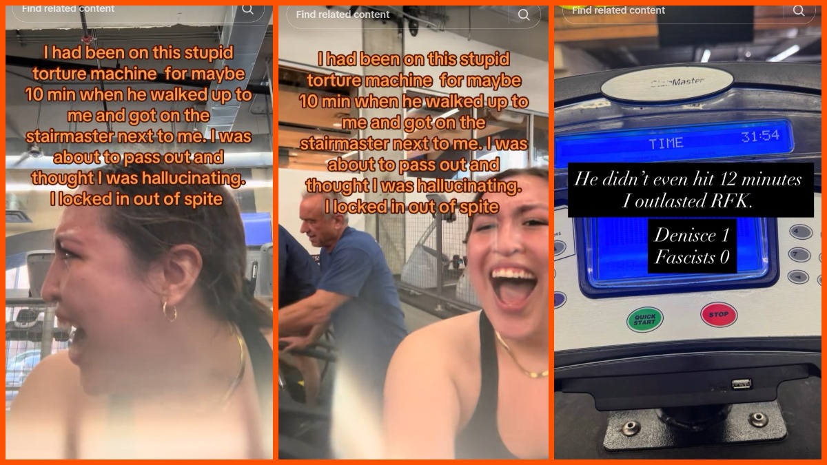 The very next day, @deniscepalacios posted on Instagram and TikTok, this one showing the health secretary from his left side. “RFK is on a stair master next to me,” she wrote, adding, “I’ve never been so determined to stay on this thing in my life.” She explained that she’d been on the “stupid torture machine” for about ten minutes when he walked up. She initially thought she was hallucinating and then “locked in out of spite.”