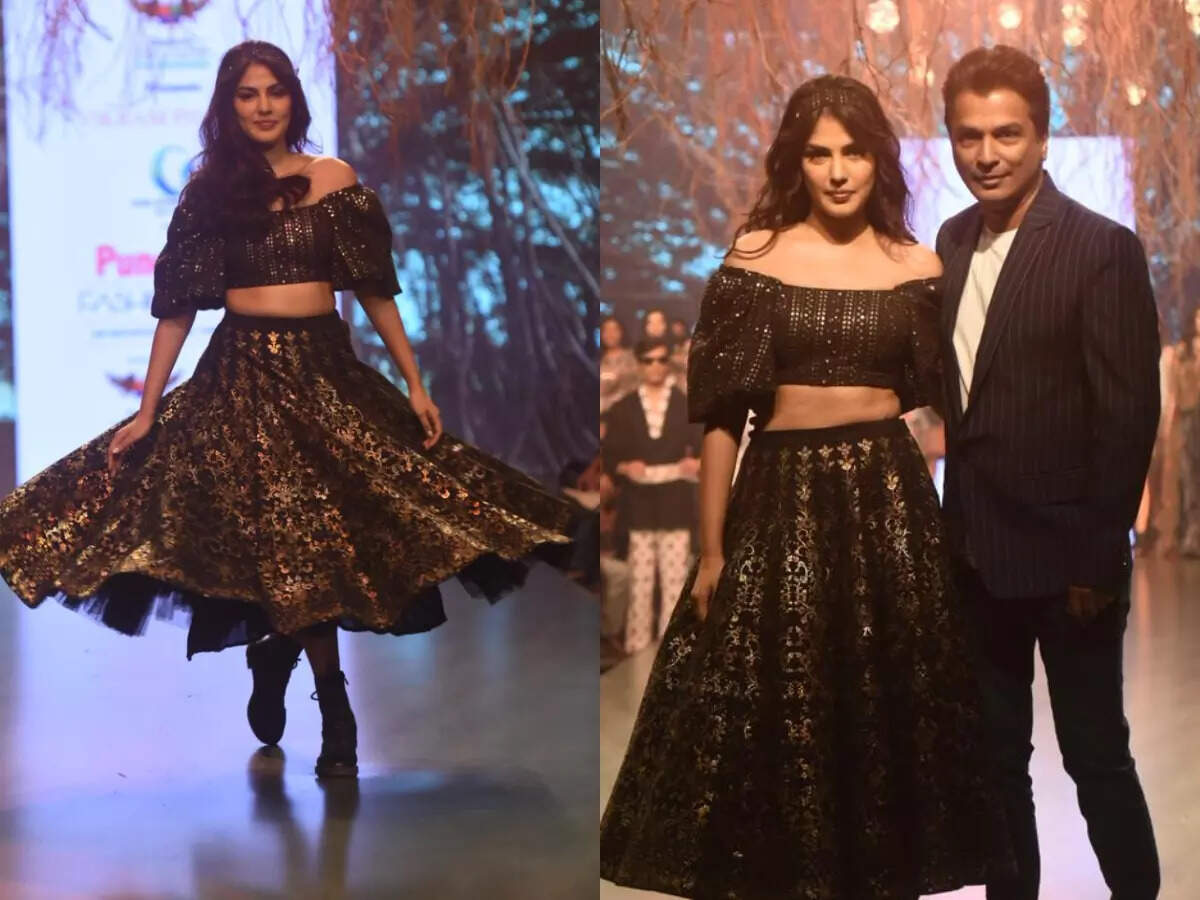 Indian film actress Rhea Chakraborty made a surprise entry on the ramp at the grand finale of Pune Times Fashion Week 2022, and left everyone asking for more! The actress stunned in black co-ord set - an off-shoulder top and skirt with sequence work, which exuded perfect bohemian vibes.