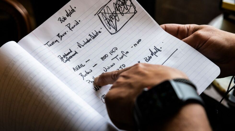 On a table sits a stack of coffee table books about Black Flag and punk T-shirts, as well as a dozen notebooks that have his notes and scribblings from over the years. (When he opens them up, he flips right to the page about Butter Stamos; on another page is a note about wanting to break a Guinness World Record.)