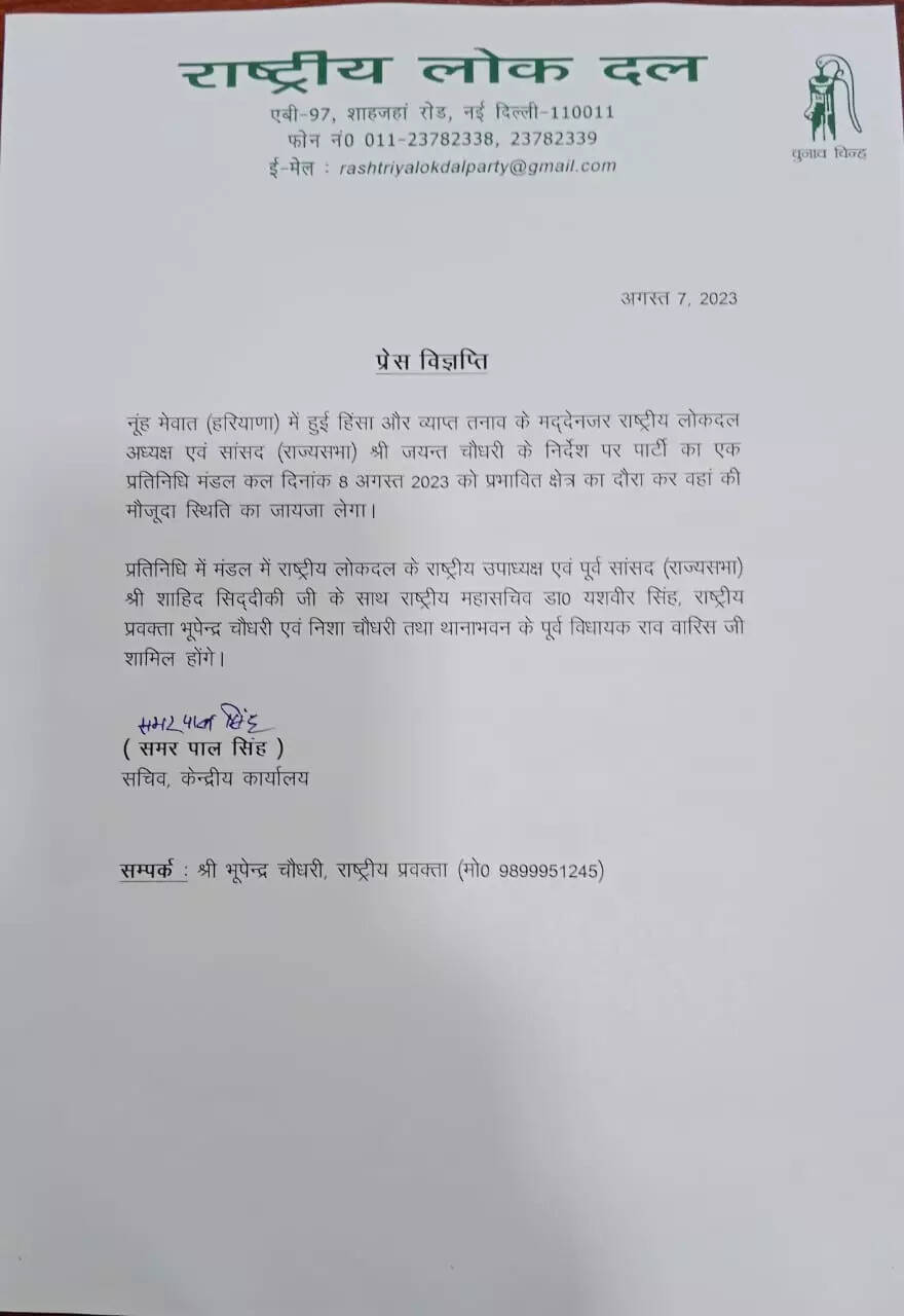 LUCKNOW: A delegation of Rashtriya Lok Dal will visit the riot-hit Nuh (Mewat) district of Haryana on Tuesday to meet the victims of the violence that erupted on July 31.
