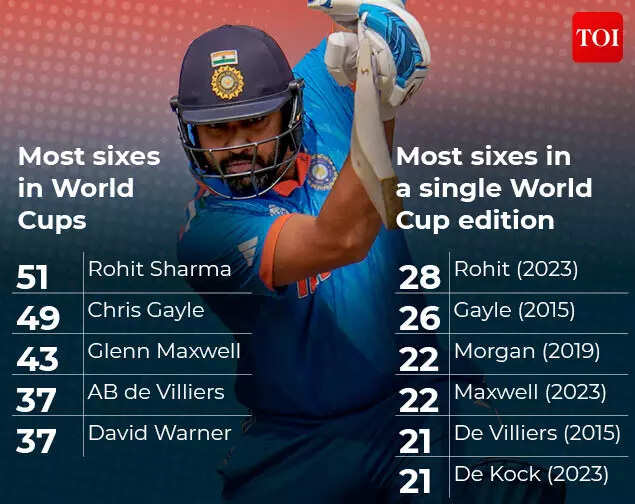 NEW DELHI: Rohit Sharma, the Indian cricket team's star opener, made headlines on Wednesday as he became the first batter to hit 50-plus sixes in the World Cup. This remarkable feat saw him surpass the previous record held by West Indies legend Chris Gayle, who had hit 49 sixes in the prestigious tournament.