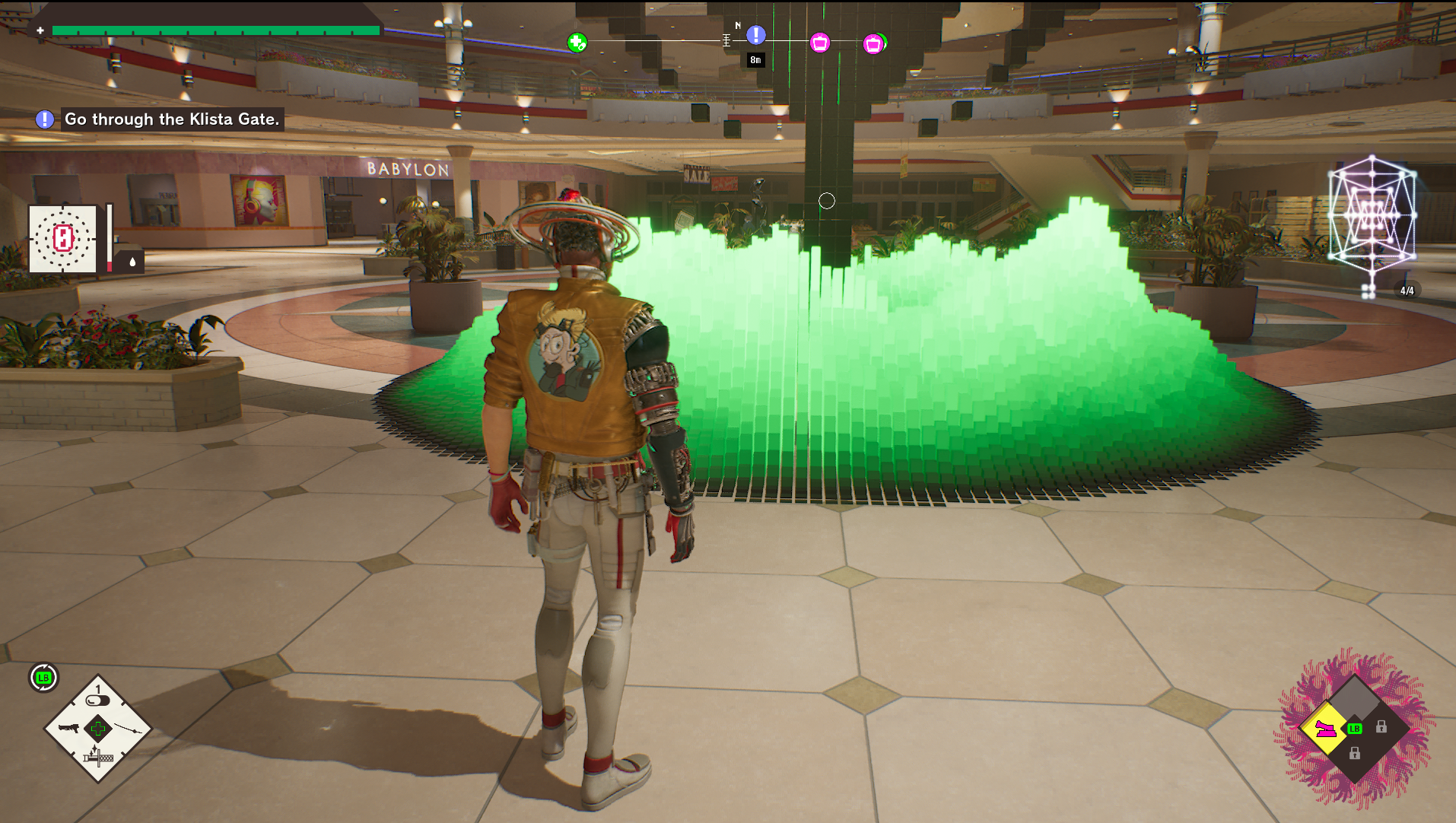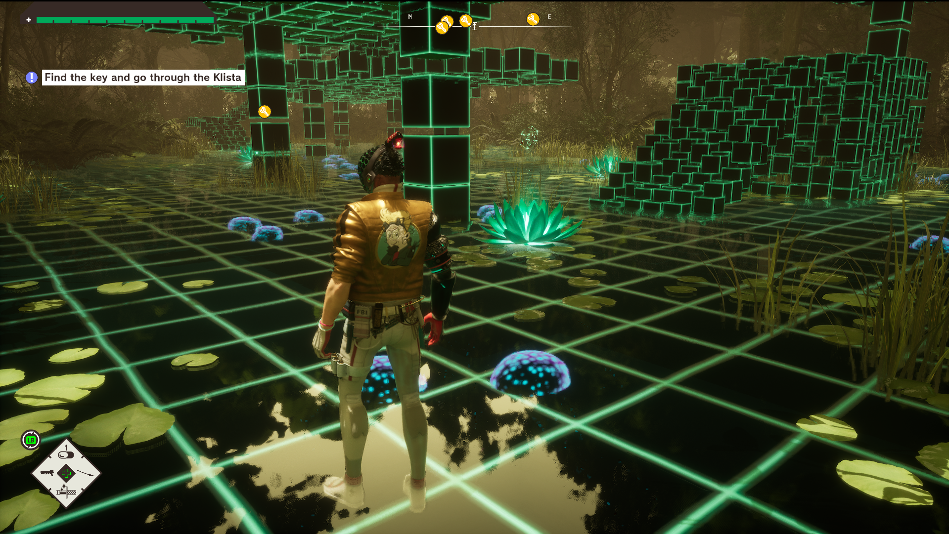 Even in the main 3D third-person gameplay levels, there are several distinct art styles, as Romeo must solve puzzles by descending into subspace, which turns out to be a Tron-influenced, retro-computer-graphics-inspired version of the world above. Accessed, naturally, via CRT televisions which run some sublime, luridly-coloured pastiches of 16-bit pixel-art, and in which Romeo has amusingly cod-philosophical discussions with a shadowy character.