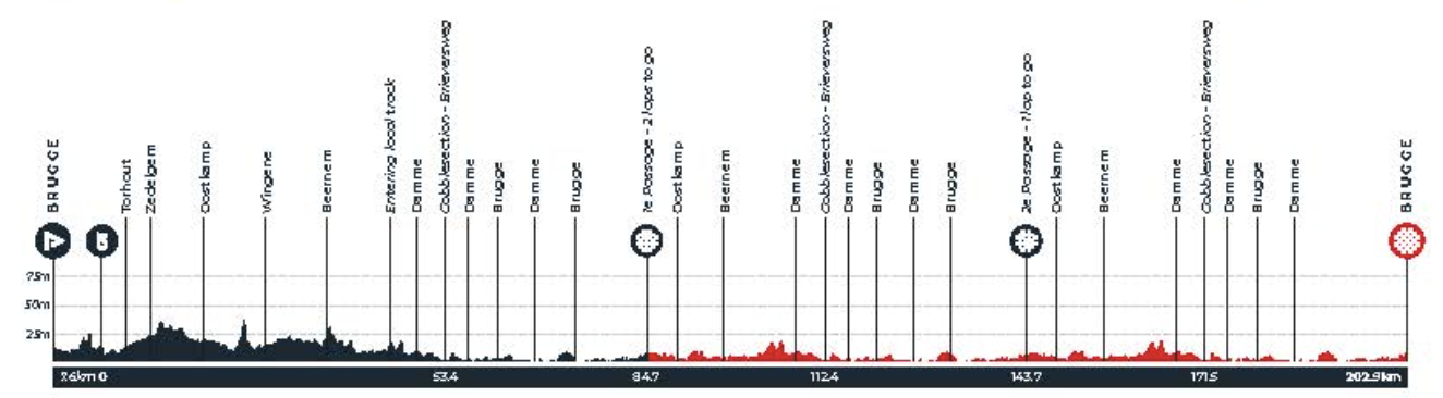 Now starting and finishing in Bruges – passing on the previous finish on the coast in De Panne – the men's race will take on a flat 202.9km unfolding over two loops.