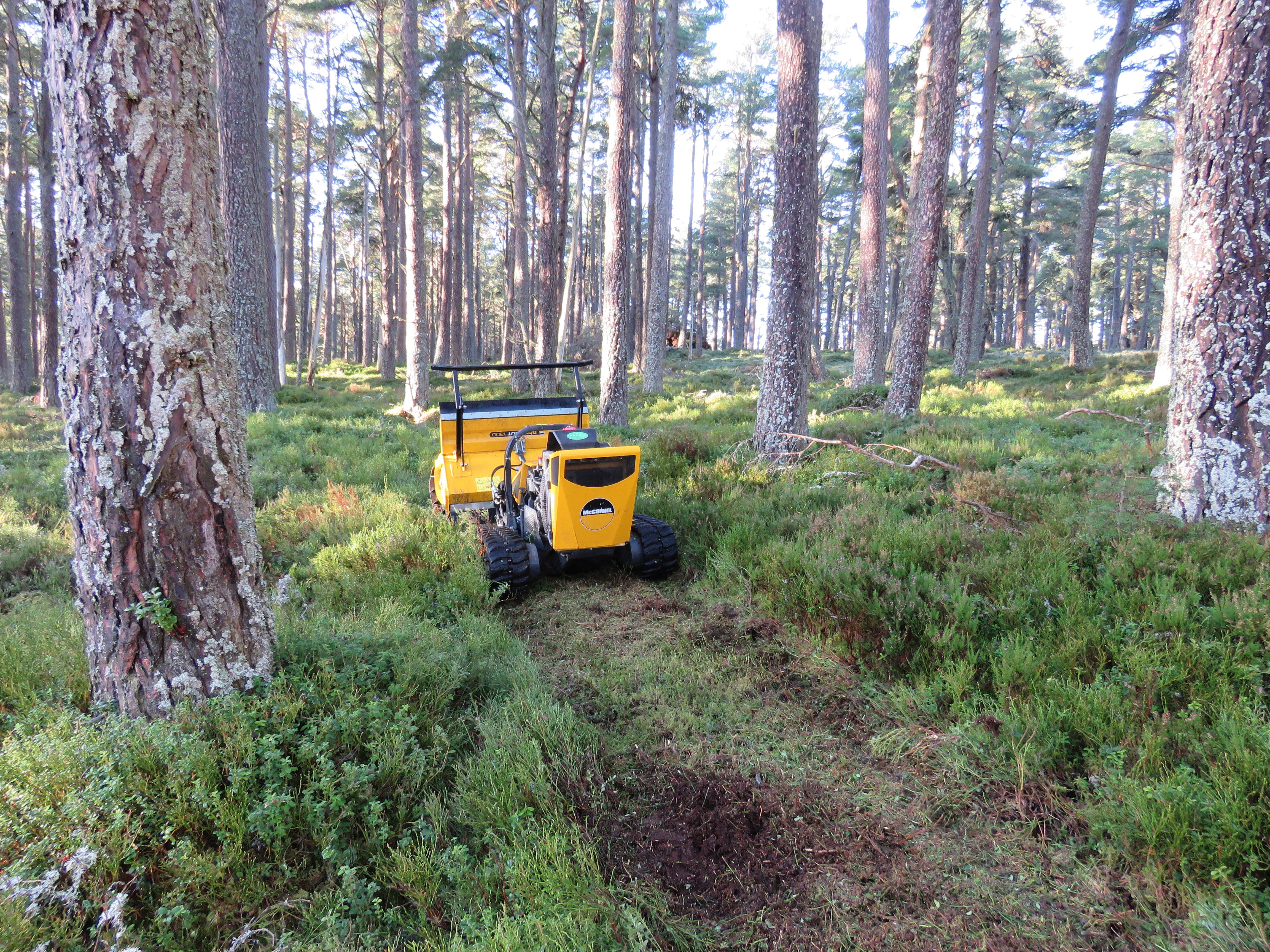 A remote-controlled mower is used to remove dominant heather in difficult terrain to allow blaeberry to emerge which is an important food source for capercaillie.