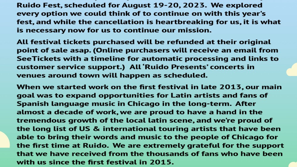 “When we started work on the first festival in late 2013, our main goal was to expand opportunities for Latin artists and fans of Spanish Language music in Chicago in the long-term,” the Ruido fest statement said. “... We are extremely grateful for the support that we have received from the thousands of fans who have been with us since the first festival in 2015.”