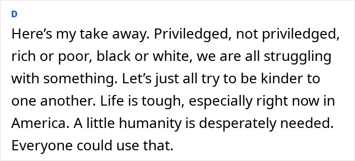 “But this particular post wasn’t about privilege or comparing circumstances, and it feels like people are assuming I was ignoring that when that wasn’t the conversation I was trying to have.”