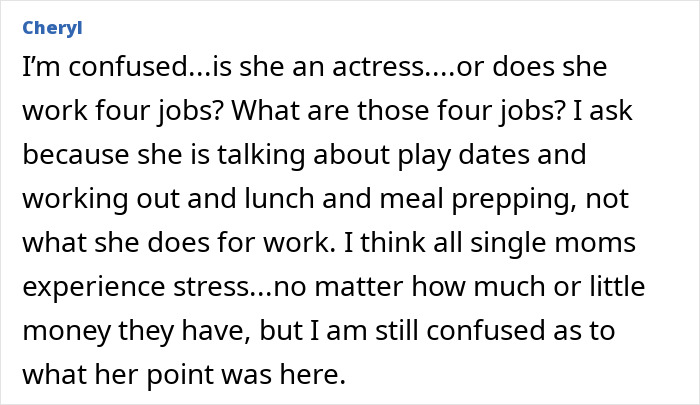 “I don’t live off a trust fund or get money from my parents. Most of the time I don’t have help with her. So how about y’all pause before you judge and assume.”
