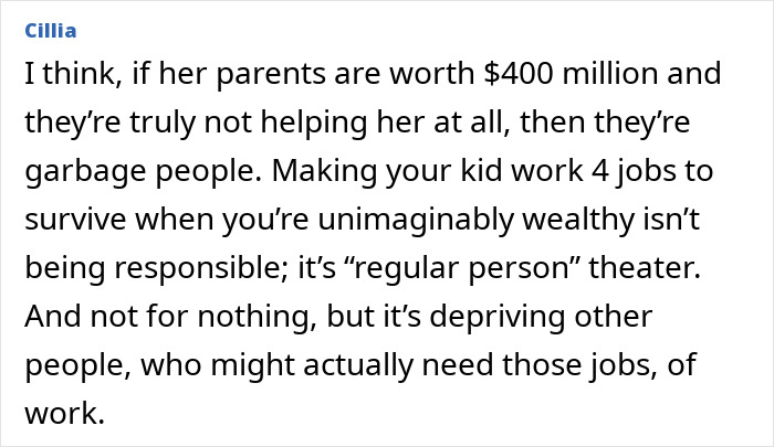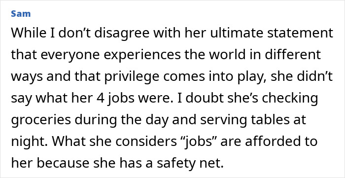 “While I don’t disagree with her ultimate statement that everyone experiences the world in different ways, she didn’t say what her 4 jobs were,” another added. “I doubt she’s checking groceries during the day and serving tables at night. What she considers ‘jobs’ are afforded to her because she has a safety net.”