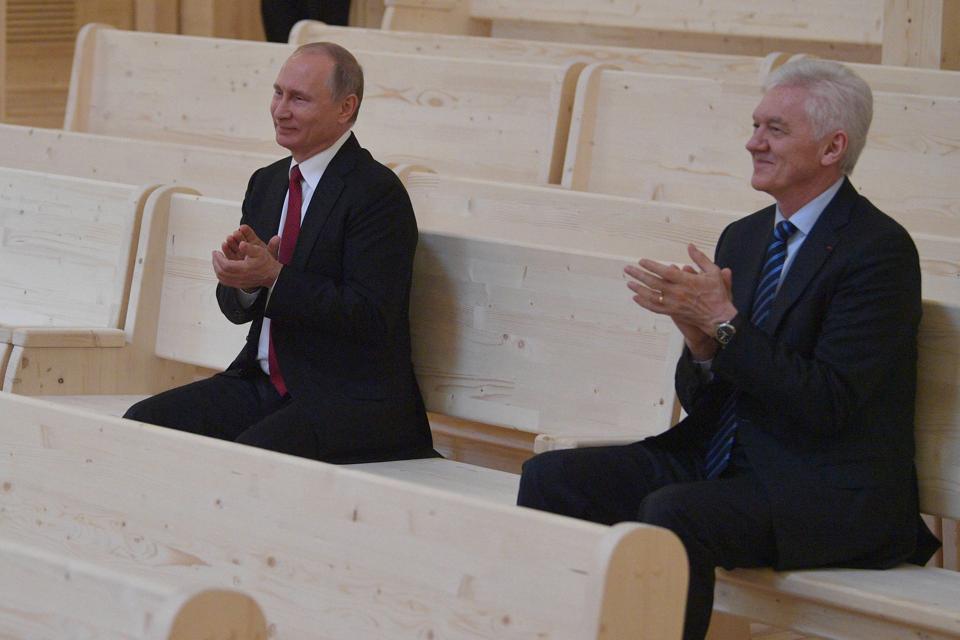 Russian billionaire Gennady Timchenko, right, faced new sanctions Tuesday following the widely condemned recognition of two eastern Ukrainian rebel states by Russian President Vladimir Putin, left. TASS via Getty Images