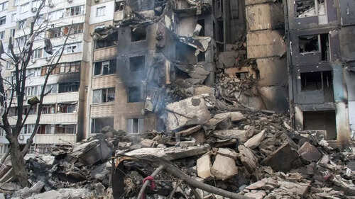 <p>An apartment building is seen damaged after shelling in Kharkiv, Ukraine.</p>3/10:RU1