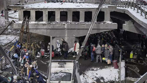 Residents of the bombarded suburbs of Ukraine's capital snaked their way across the slippery wooden planks of a makeshift bridge that provided the only way to escape Russian shelling, amid renewed efforts Wednesday to rescue civilians from besieged cities.