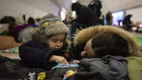<p>A woman and her child sit on the pavement in a subway station turned into a shelter in Kyiv.</p>10/10:RU1