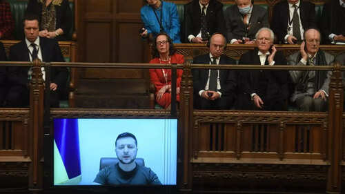 <p>Ukrainian President Volodymyr Zelenskyy urged the UK to increase sanctions on Russia, to recognize Russia as “a terrorist country” and to keep Ukraine’s skies safe. ( Photo provided by UK Parliament)</p>9/10:RU1