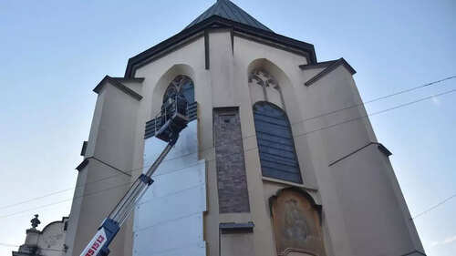 <p>Workers attach shields to the facade of a cathedral to protect ancient glass windows in case of an assault.</p>5/10:RU1
