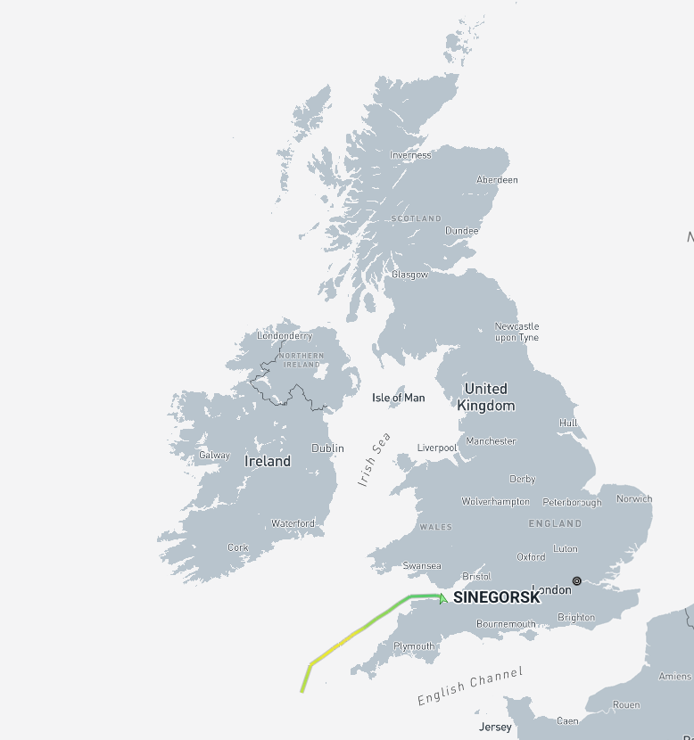 Sinegorsk’s last recorded port call was three weeks ago at Arkhangelsk, Russia, a major trading port where Russia’s Northern Fleet has a naval base, shipping data confirms.