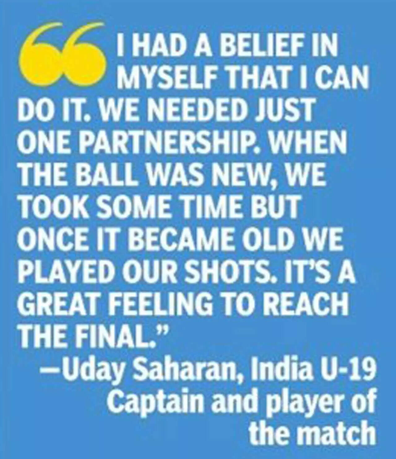 NEW DELHI: Sachin Dhas and skipper Uday Saharan struck contrasting half-centuries in a remarkable 171-run stand as India pipped South Africa in a thriller to enter fifth straight Under 19 World Cup final in Benoni on Tuesday.