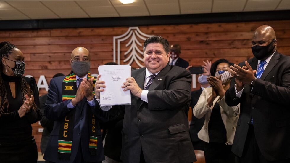 Flanked by lawmakers and supporters, Gov. J.B. Pritzker picks up the nearly 800-page criminal justice reform bill after signing it into law during a ceremony at Chicago State University on the South Side, Monday, Feb. 22, 2021. (Ashlee Rezin Garcia/Sun-Times)