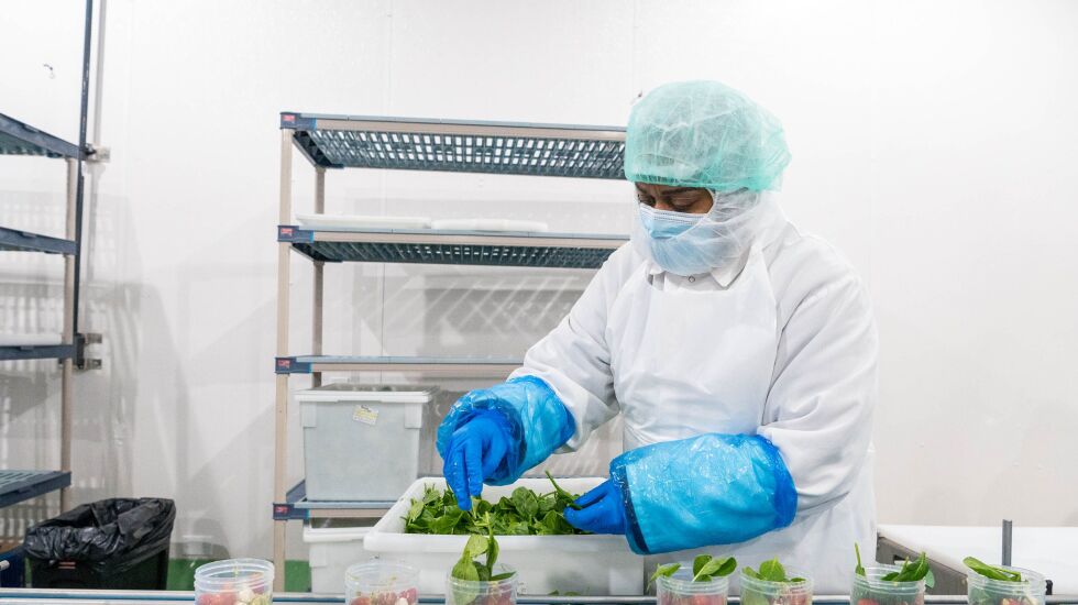 Draped head to toe, from hairnet to shoe covers, Terri Burnett stands alongside dozens of similarly-clad workers in a 37 degree room, grabbing handfuls of dark green spinach from a white trough and poking them into round clear plastic jars of pesto pasta hurrying past her on a conveyor line.