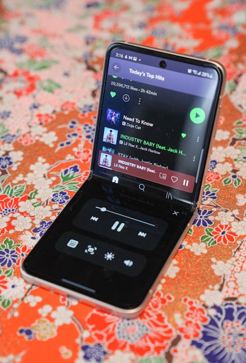 While the Z Flip 3 works as well as a regular non-folding phone when it’s unfolded, I can’t say the Flex mode feature — activated when unfolding the phone halfway — is any more compelling than a year ago. It still feels half-baked. This time in addition to optimized apps like YouTube that can show content on the top and bottom, there’s a Labs feature that lets you force apps to use Flex mode. You can choose which apps you want to do this within the Settings app, but the sad reality is that most apps that aren’t natively optimized just get squished to display on the top half. For media apps, you’ll get some playback controls like play / pause, skip / forward, and scrubbing. But mostly, you get a bar of four controls: shortcut for Quick Settings, screenshot button, brightness, and volume controls.