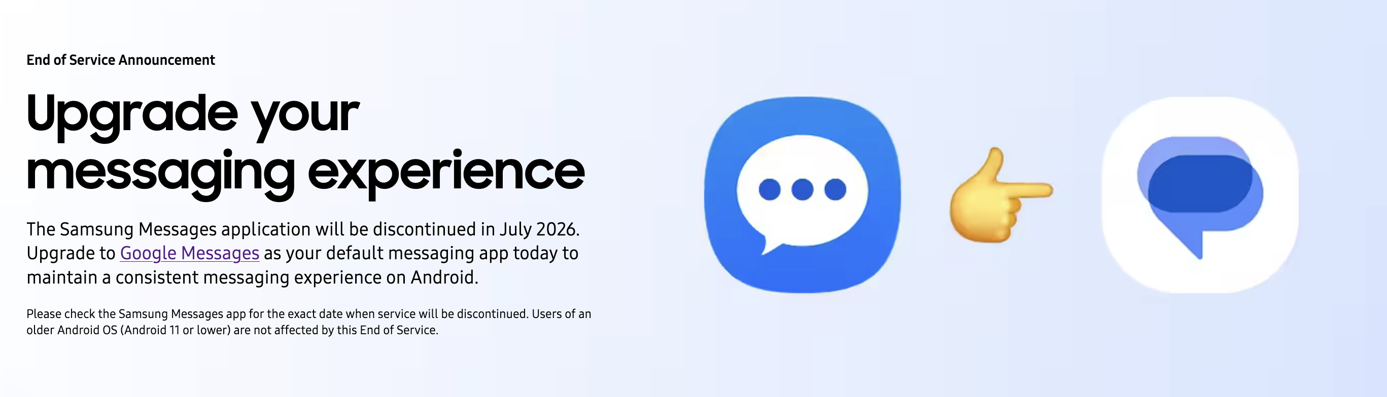 - Samsung will discontinue its Messages app in July 2026 and require users to switch to Google Messages.