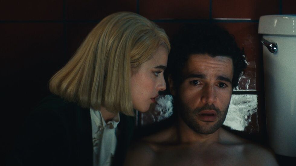 Set in an expansive, well-appointed hotel suite that gives off a bit of a horror movie vibe with its rich and saturated colors, “Sanctuary” begins with Qualley’s Rebecca in a blonde bob and velvety, hunter green business suit, sitting across the table from Abbott’s slightly disheveled and sweaty Hal, screening him for a position as CEO of his father’s hotel empire. The questions become ever more personal and bizarre, with Rebecca quizzing Hal about his drug and alcohol use, when he lost his virginity, whether he “f---s like Caligula” — until they break character, and we see they’re actually role-playing from a script, literally a script.