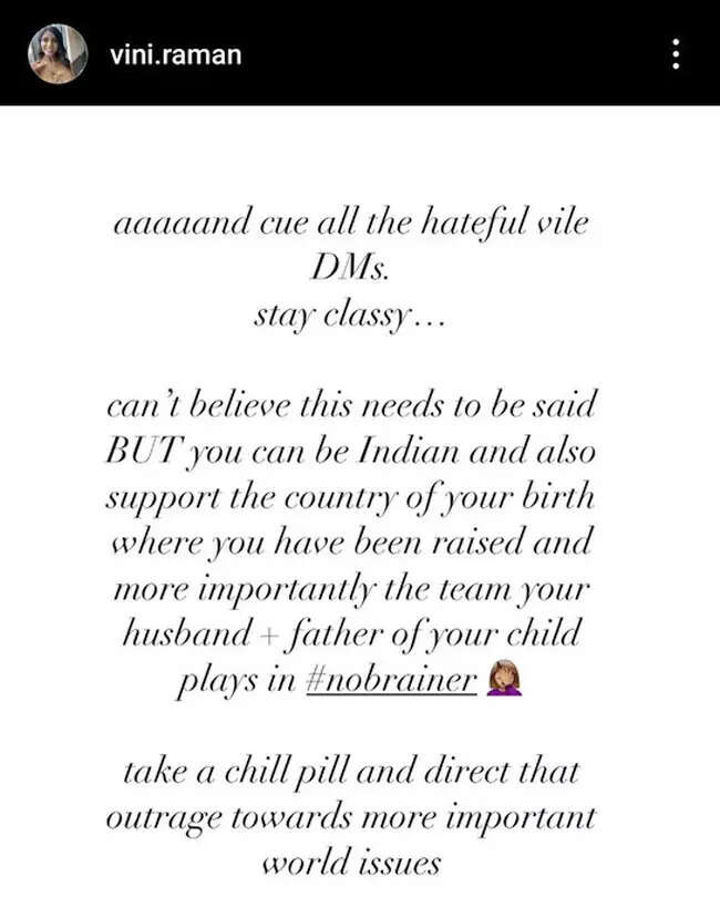 "Can't believe this needs to said BUT you can be Indian and also support the country of your birth where you have been raised and more importantly the team your husband + father of your child plays in #nobrainer. Take a chill pill and direct that outrage towards more important issues" Vini shared her ordeal in an Instagram story.