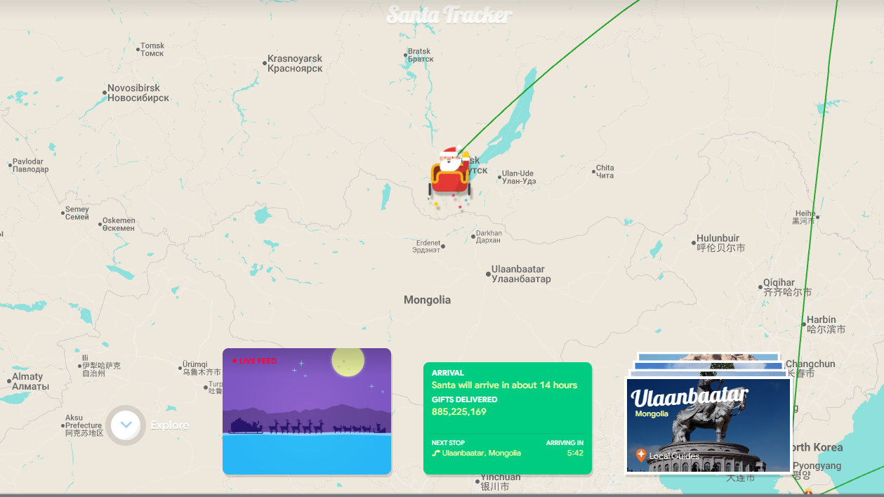 Let's check in with how Santa is getting on. According to Google's tracker, he's on his way to Ulaanbaaatar, the capital city of Mongolia.