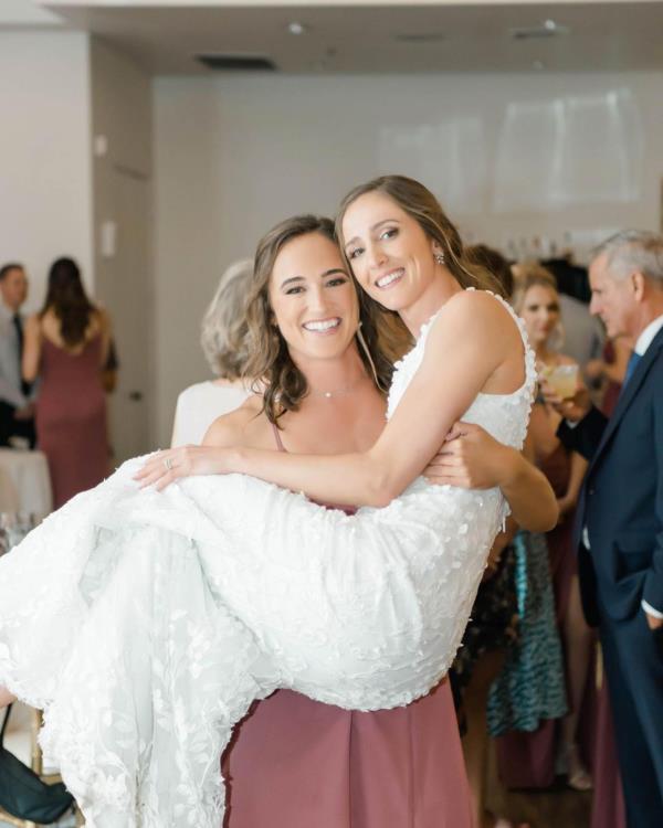 Professional beach volleyball player Sarah Sponcil recently shared a heartwarming picture on social media that captured a beautiful moment at her friend's wedding. In the photo, Sarah can be seen smiling brightly as she holds her friend, who is the bride, in her arms. Both women are beaming with joy, radiating happiness and love in the midst of the celebration.