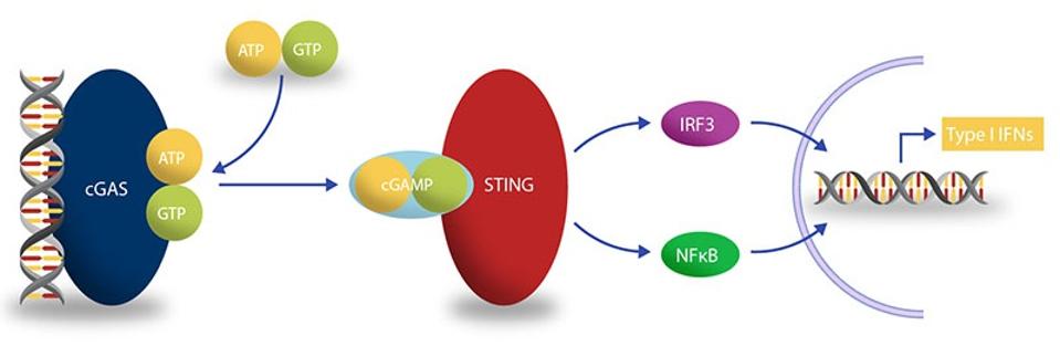 Curious to determine how exactly cell fusion triggers IFN-β activation, the team of scientists turned to one of the central signaling pathways of the innate immune system, the cGAS–STING pathway (Figure 3). This pathway kicks off with the detection of misplaced DNA by an enzyme called cGAMP synthase (cGAS). DNA is usually found in the nucleus of a cell, so its presence in the cytoplasm indicates either cellular damage or microbial infection. cGAS binds to the misplaced DNA, triggering the formation of cyclic GMP-AMP (cGAMP). This, in turn, goes on to bind to Stimulator of Interferon Genes (STING), a protein in charge of inducing the production of type 1 interferons such as IFN-β. With STING in the game, interferon regulatory factor 3 (IFR3) undergoes phosphorylation. Once phosphorylated, IFR3 can travel to the nucleus of the cell in order to upregulate inflammatory genes.