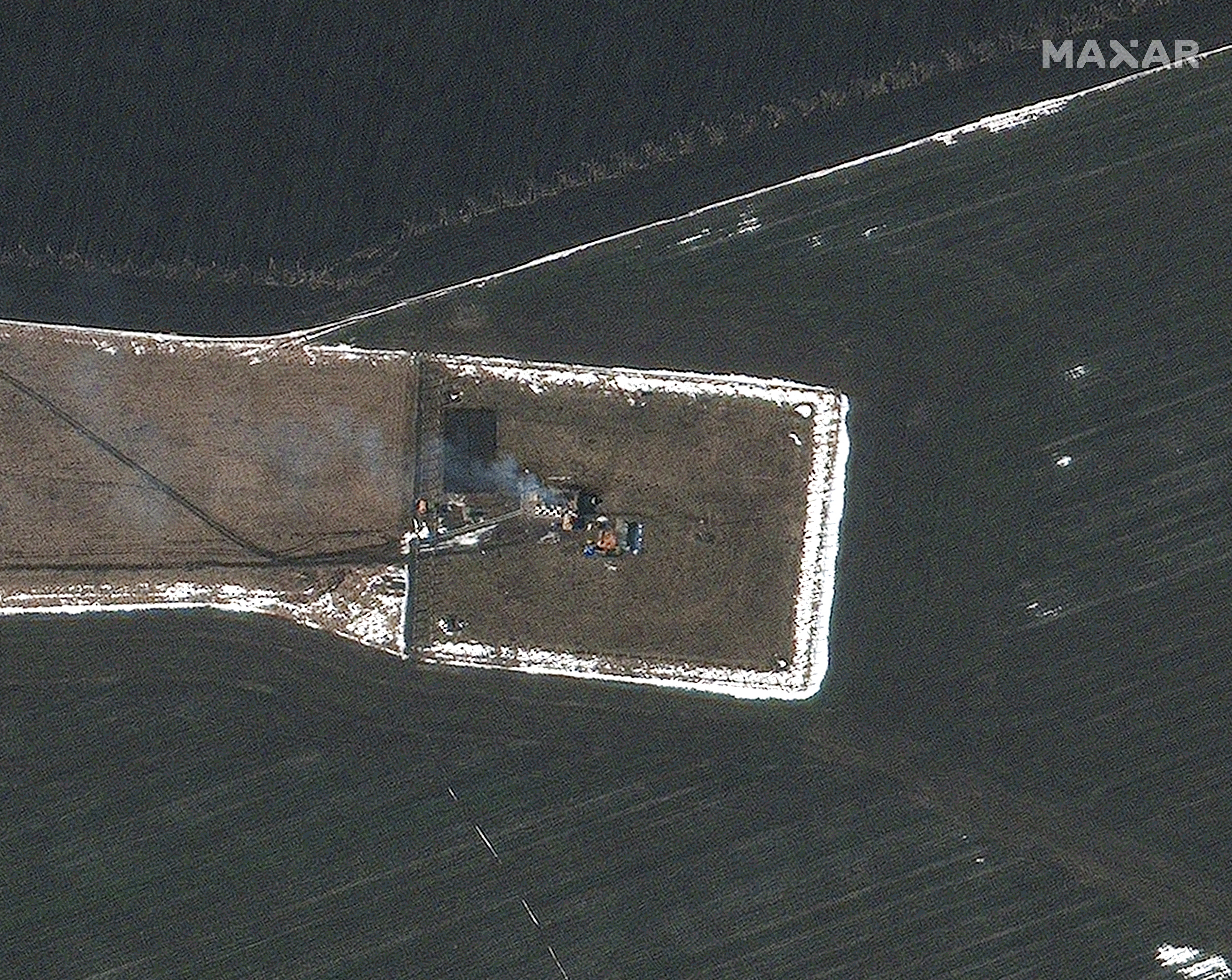 Images from space tech company Maxar Technologies show a dark plume of smoke rising from the airfield in Chuhuiv, near Kharkiv in the east as well as a lighter plume, possibly from a nearby building.