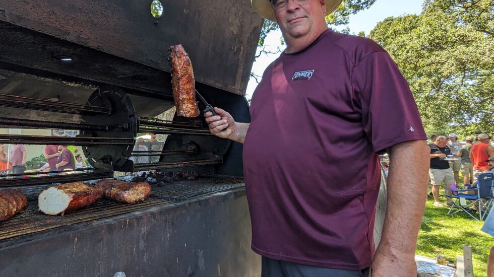Danny Ehmen by his whole-hog rotisserie at Johnson’s Grove Park in Lacon for the public waterfowl blind draw for Woodford SFWA. (Dale Bowman)