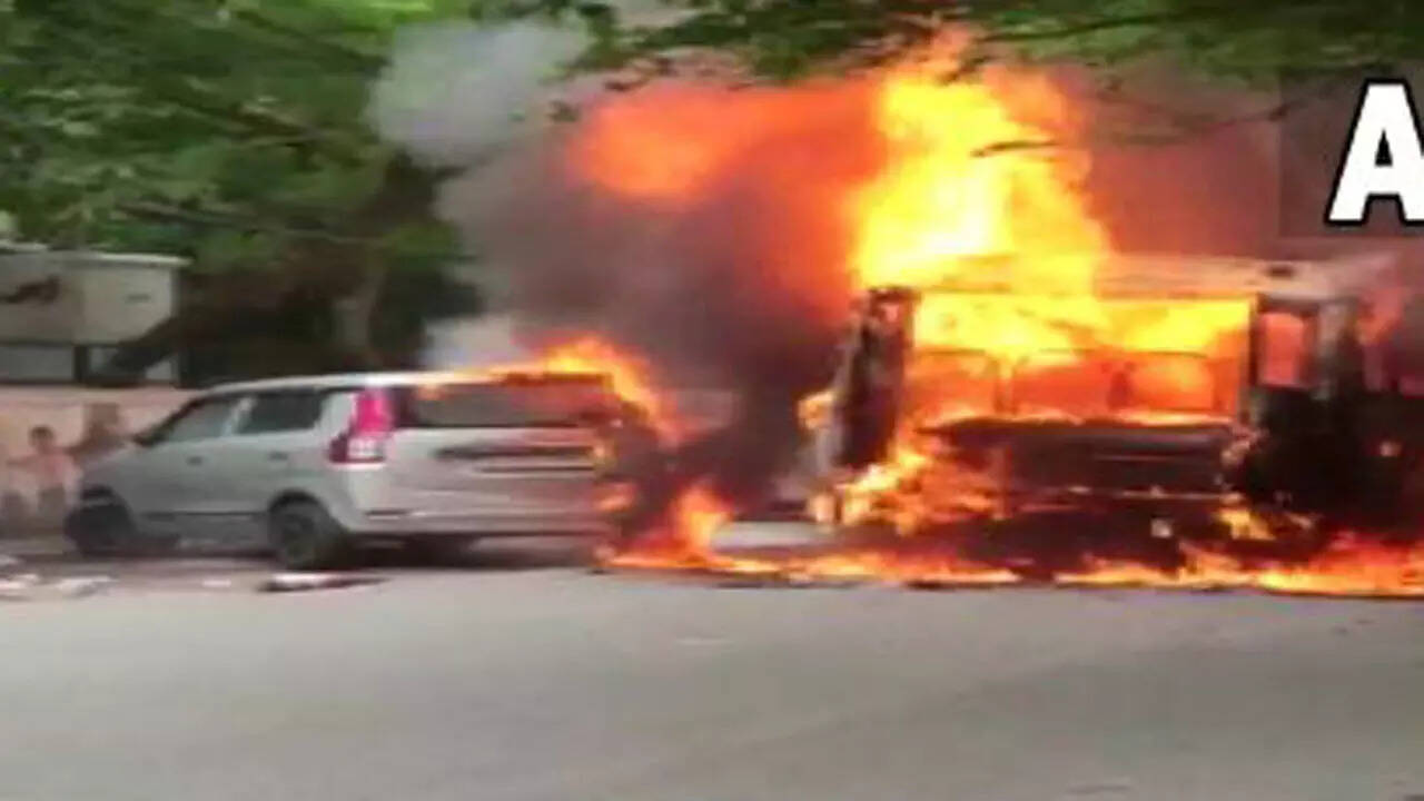 Delhi Fire Services director Atul Garg said the vehicle caught fire near a dispensary at Sai Baba Mandir T-point in Rohini Sector 7.