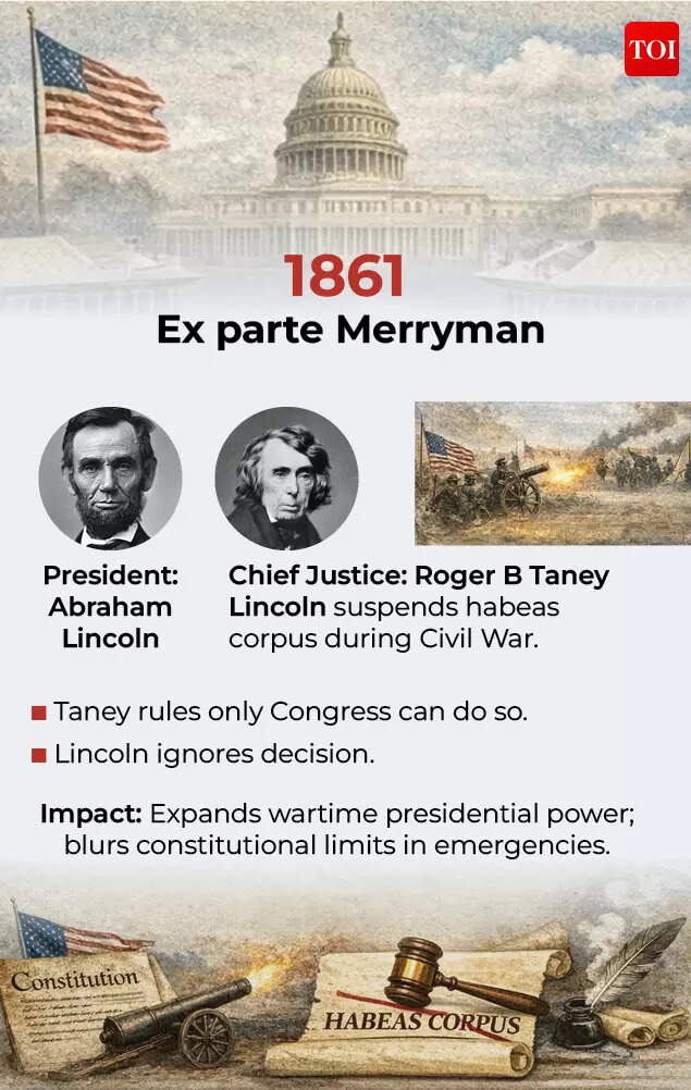 In Ex parte Merryman, Chief Justice Roger B Taney, sitting as a circuit judge, ruled that only Congress had the constitutional authority to suspend habeas corpus under Article I. He declared Lincoln’s unilateral action unconstitutional and ordered the release of John Merryman, a Maryland secessionist.