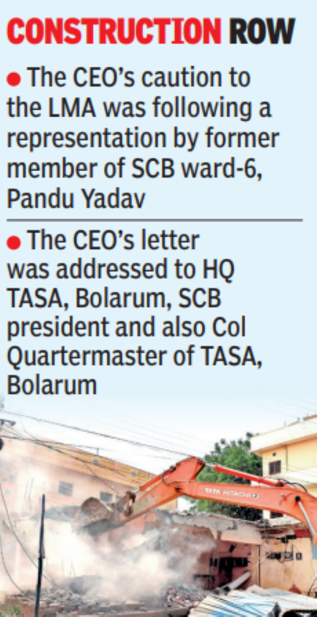 SECUNDERABAD: In a swift bid to put a lid on the row between local military authority (LMA) and civilians over alleged rule violation in house construction in notified civil areas in ward-6, the Secunderabad Cantonment Board (SCB) CEO has written to the LMA to refrain from issuing demolition threats.