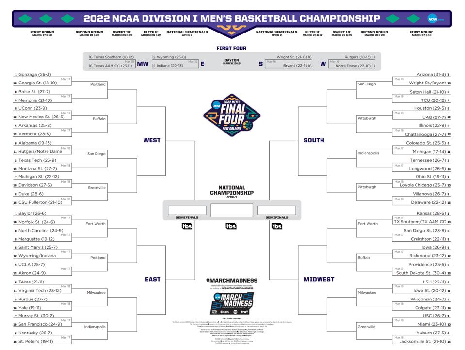 You can find the March Madness bracket below or click here for a printable NCAA Tournament bracket.