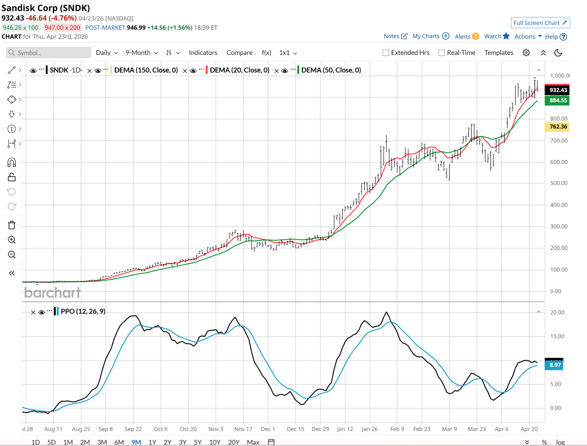 A 2-week stay around $900 a share is not exactly my definition of “the pause that refreshes.” This is still a helium-like stock. And like a balloon made of that gas, gravity eventually wins. That makes a case for SNDQ.