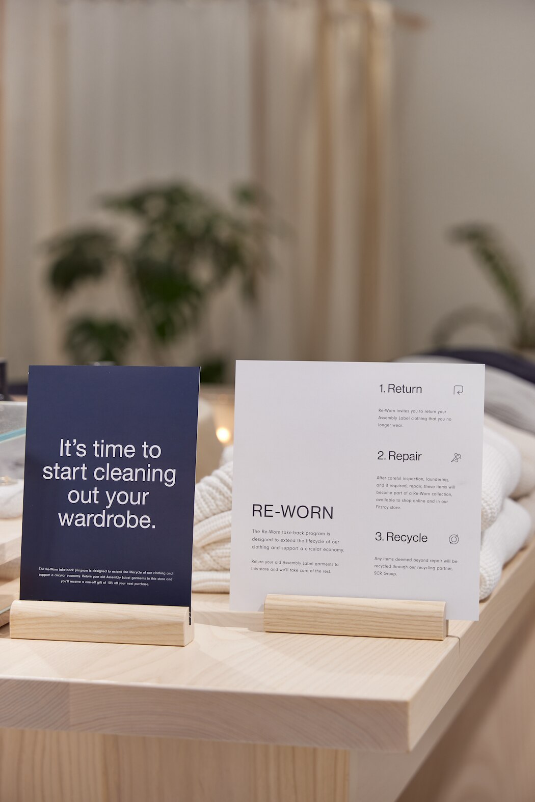 Reworn encourages people to bring back clothes that they've bought off the label previously and aren't wearing anymore. The incentive for them to do this is 10 per cent off their next purchase instore. Assembly Label then re-sells the old clothes and keeps the cash.